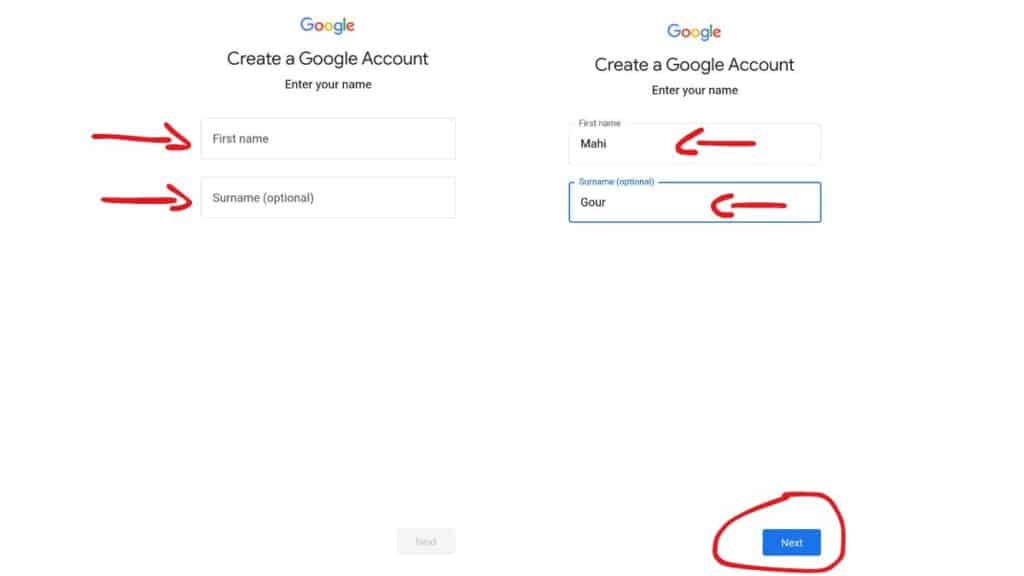 • Name: अपना ‘First Name’ (जैसे: राहुल) और ‘Surname’ (जैसे: कुमार) डालें और Next दबाएं।