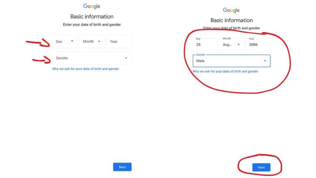 Basic Information: अब अपनी Date of Birth (जन्म की तारीख) और Gender (Male/Female) चुनकर Next पर क्लिक करें।