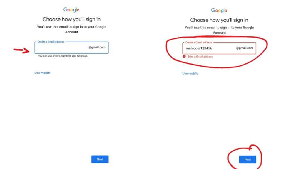 अब गूगल आपको कुछ ईमेल आईडी के ऑप्शन देगा। आप चाहें तो उनमें से चुन सकते हैं, या फिर ‘Create your own Gmail address’ पर क्लिक करके अपनी पसंद की आईडी बना सकते हैं (जैसे: rahulkumar2026@gmail.com)। यही आपकी प्ले स्टोर की आईडी होगी।